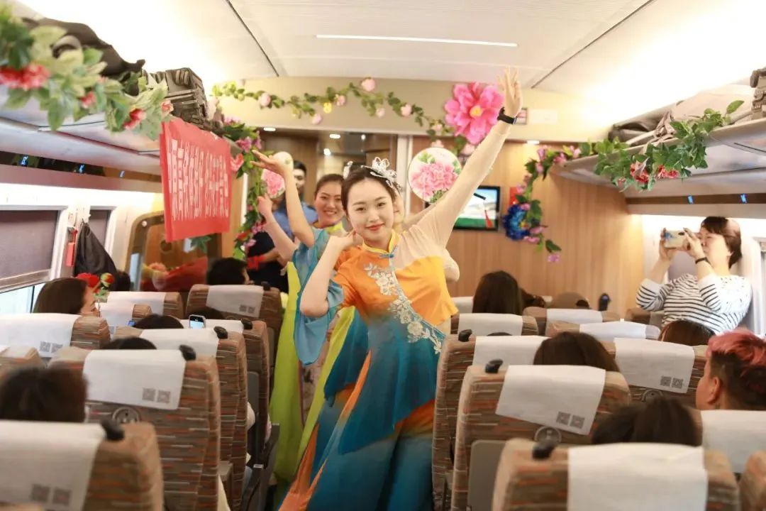 国风表演精彩纷呈列车行驶途中,高铁乘务员组织了“大美中国·国风牡丹”文艺演出,让旅客们可以感受洛阳的风土人情。