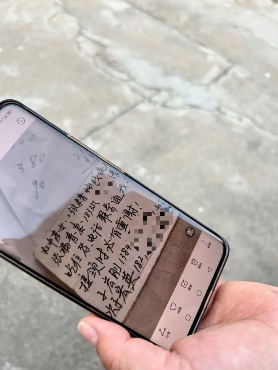 ●福青给中秀写的、防走丢的纸片。蔡家欣 摄。冬下雪及倒烟桶,我已74岁,不能做上两项事