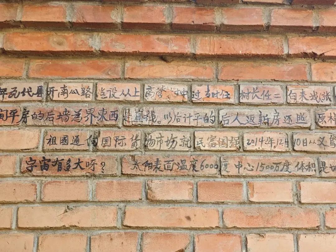 ●进门处的照壁上,福青好奇发问:宇宙有多大呀?蔡山海 摄。父子俩的最后一次见面停留在正月初八。宏英离家北上,福青站在家门口目送,就穿着黑色的驼绒裤和上衣,还有那双足力健棉靴。“我母亲的情况是这样,他得每天累,深颜色的衣服耐脏。”宏英说。