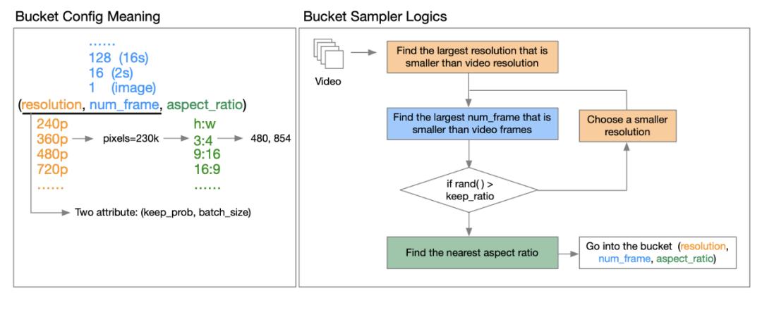 OpenAI Sora的技术报告[3]指出,使用原始视频的分辨率、长宽比和长度进行训练可以增加采样灵活性,改善帧和构图。对此,作者团队提出了分桶的策略。