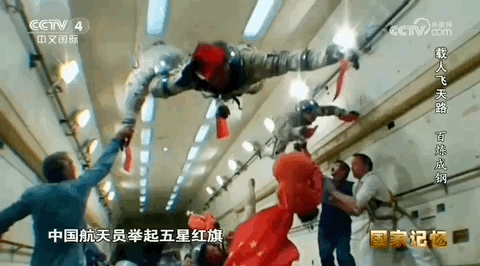 中国航天员虽然是第一次参与这项训练,失重时身体都纷纷飘了起来,但是他们个个神情自若,不断做着规定的训练动作。飞行过程中,中国航天员举起五星红旗,梦想着有一天这面国旗能够飘扬在太空之中。