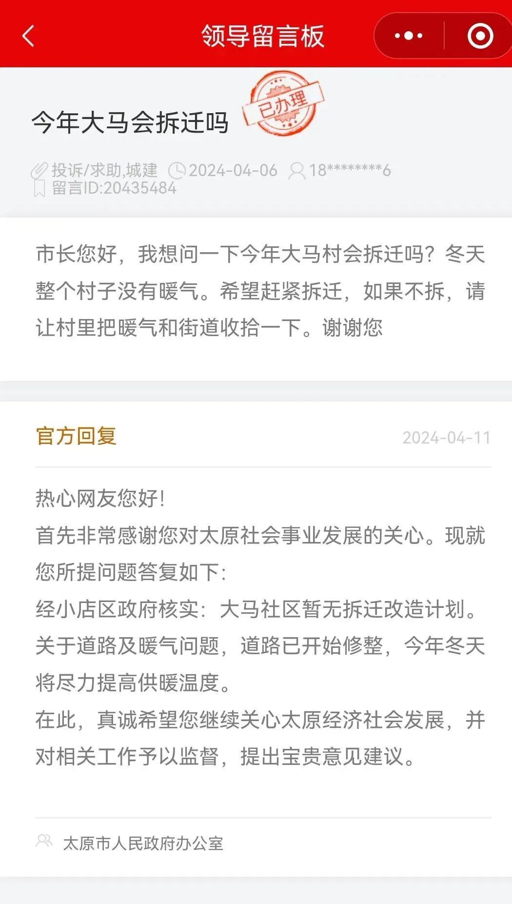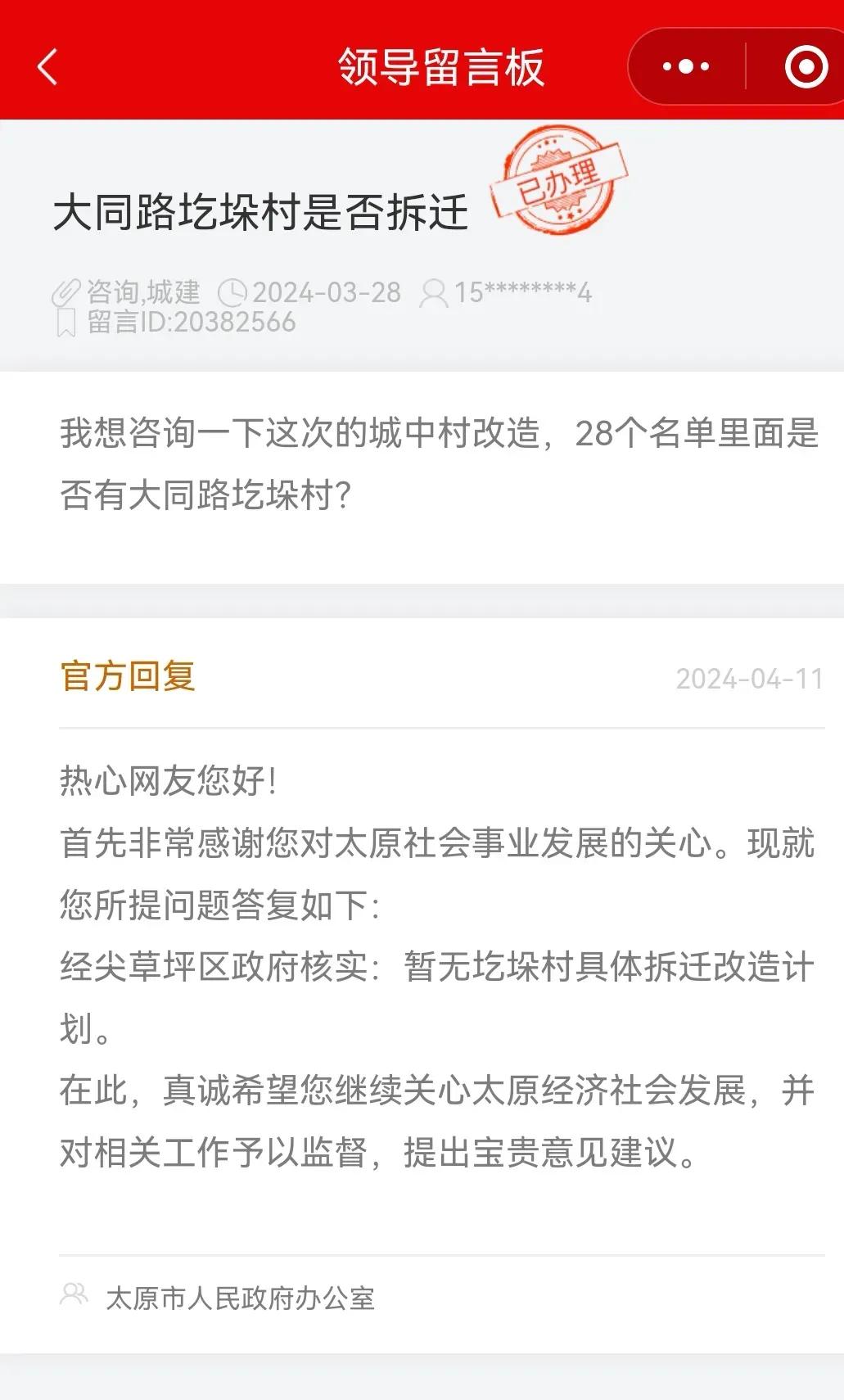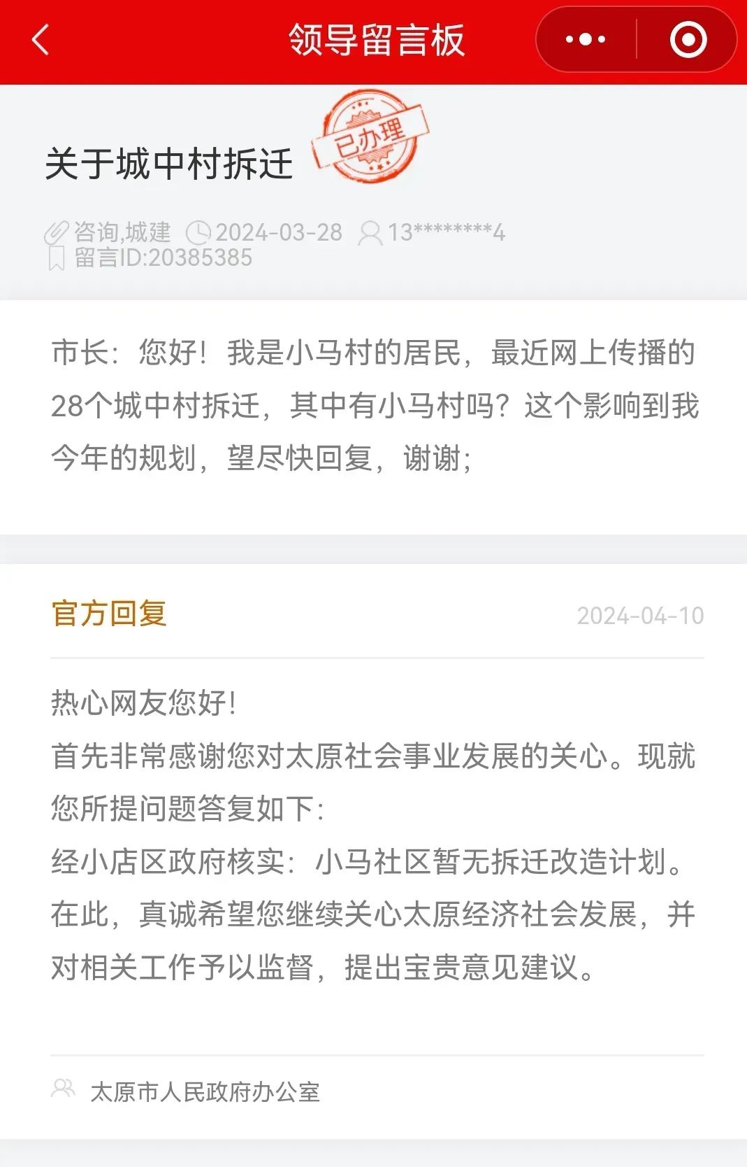 关于太原大马、小马、许西、西吴拆迁计划,官方回复