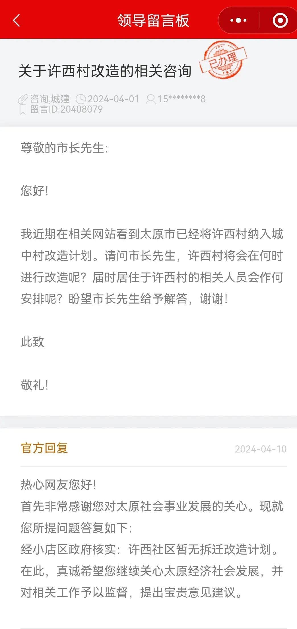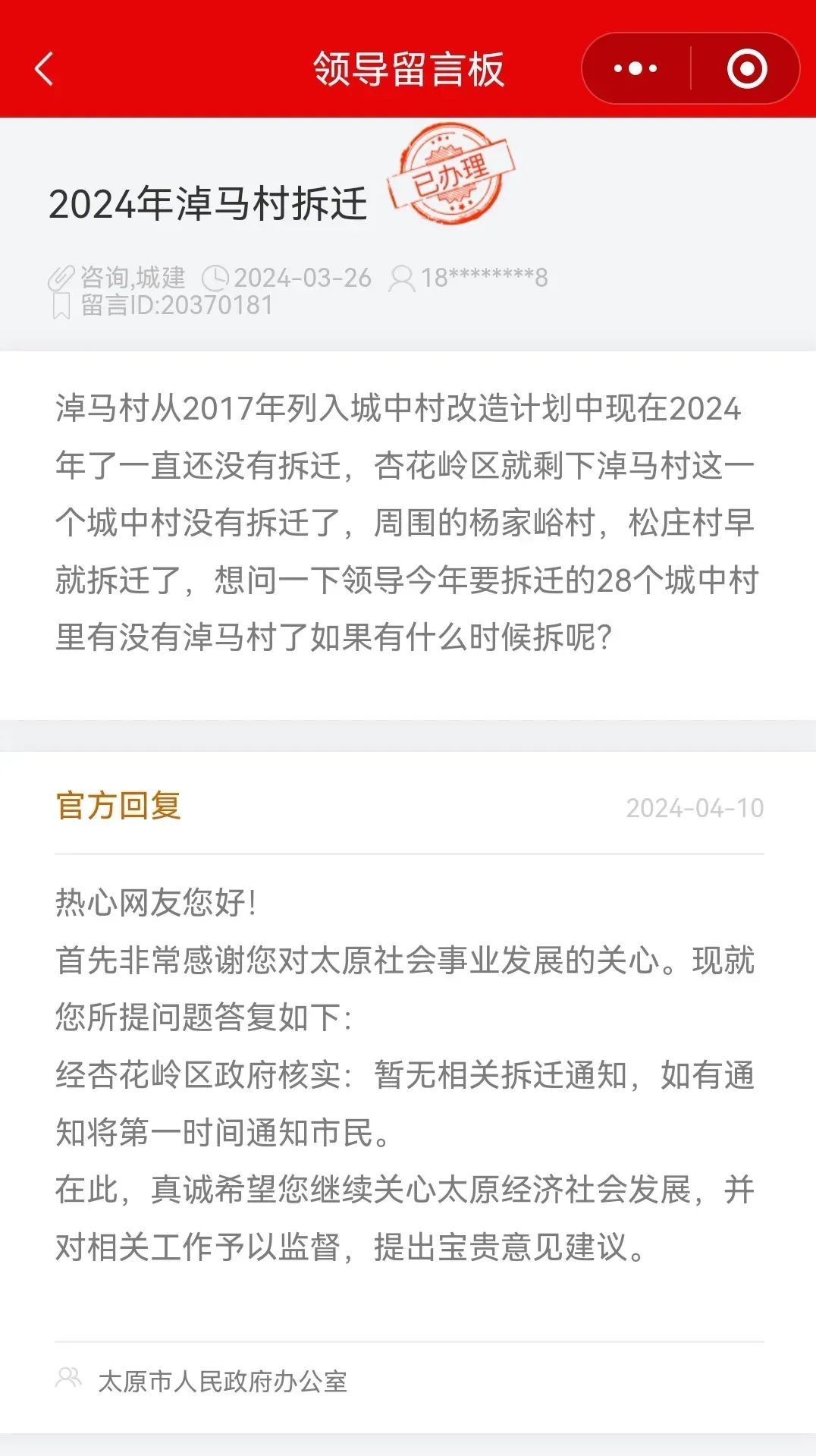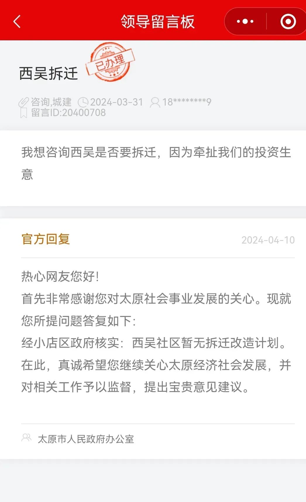 关于太原大马、小马、许西、西吴拆迁计划,官方回复