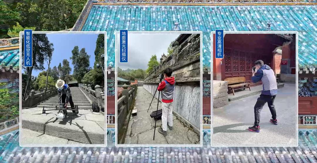 ▲武当山俯瞰图武当山数字化项目的最大难点之一,就是多学科多领域的交叉应用,且学科之间的差异非常大,需要研究人员对文化遗产有跨学科知识的累积和理解。例如,武当山上宫殿的一片瓦片,在常人看来可能只是一件可见的文物,展现了一些线条和色彩,但历史专业的老师却能注意到那些不为人所知的地方,敏锐地洞察到瓦片颜料的使用和变化所代表的文化元素和古代艺术风格。如果技术人员不理解这些文物背后的文化价值,就会导致最终成果仅仅是没有灵魂的一张图画,并不能实现呈现、保护和传播武当山悠久文化的终极愿景。