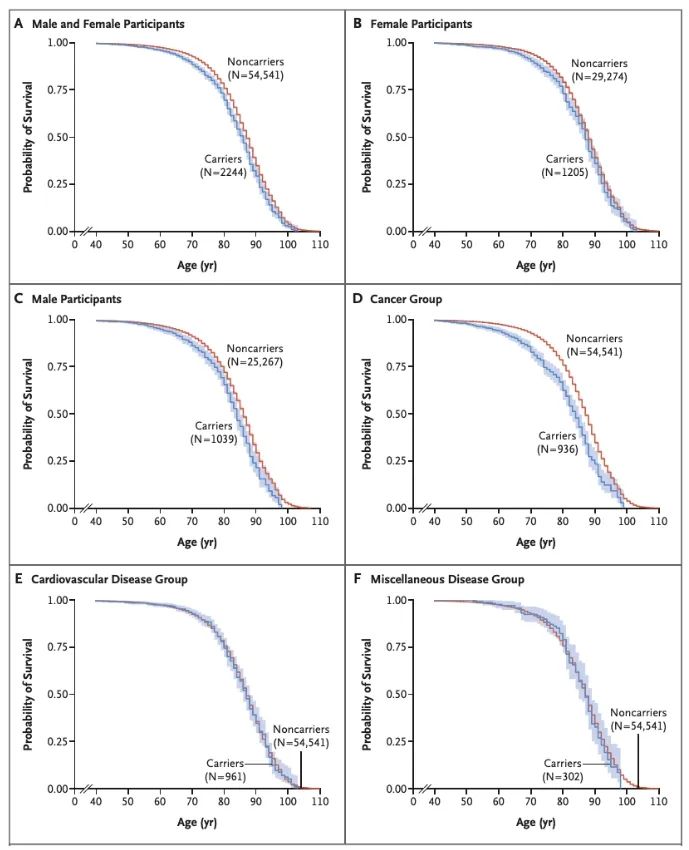 该研究主要来源于2021年5月,美国医学遗传学和基因组学学院(ACMG)发布的建议报道。当时,这份报告显示和心血管、癌症以及代谢等疾病相关的73个致病性或者可能致病性基因突变(简称“可操作基因型”)。研究发现,在57933名受试者中,有2306名(约4%)携带至少一种可操作基因型,并且10%的可操作性基因型携带者在69岁前死亡。