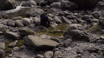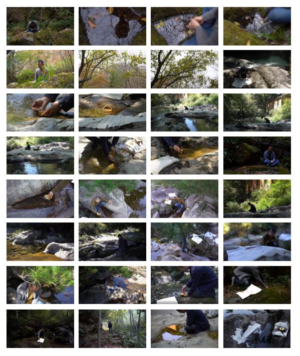 游东醌作品《水书计划》定格动画影像截图这一被艺术项目化的“行禅”是双重隐射,它不仅指涉了中国传统世界中的禅修,而且也可以被理解为是一种典型的源自于20世纪60、70年代西方的大地艺术,即对“全球当代”的借鉴。