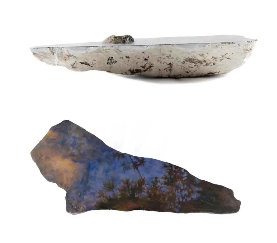 这一水潭的翻制品将成为他“画框”,此后游东醌在工作室内将某个水影的瞬间描绘在其相应的石膏平面之上,将时间永久化。被潭水浸泡并晒干的书页也会被它编辑成书,并以其采集的地点为名,成为无字的艺术文献。