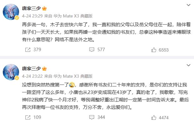 图源:当事人社交账号4月24日,唐家三少发文回应称:“感谢所有书友们二十年来的支持,是你们的支持让我一路坚持了这么多年,小唐也从23岁变成现在43岁了,真的老了,我歇歇,写完《神印2》我病了快一个月才好,等我调整好重出江湖时一定第一时间告诉大家。”