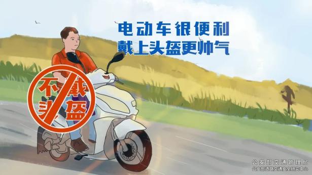 骑车出行文明守规。安全从“头”开始,骑乘摩托车、电动车正确佩戴安全头盔,骑乘戴头盔平安把家归。