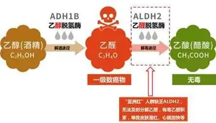 图源:生物探索其实,亚洲人的解酒能力在第一阶段并不逊色,但到了第二阶段,先天不足便暴露无遗了。由于存在ALDH2基因突变,ALDH的活性大大降低,不能很快地将乙醛转化为乙酸。