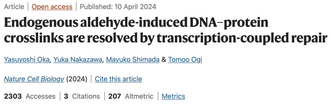 [1]Oka Y, Nakazawa Y, Shimada M, Ogi T. Endogenous aldehyde-induced DNA-protein crosslinks are resolved by transcription-coupled repair. Nat Cell Biol. 2024 Apr 10. doi: 10.1038/s41556-024-01401-2. Epub ahead of print. PMID: 38600234.
