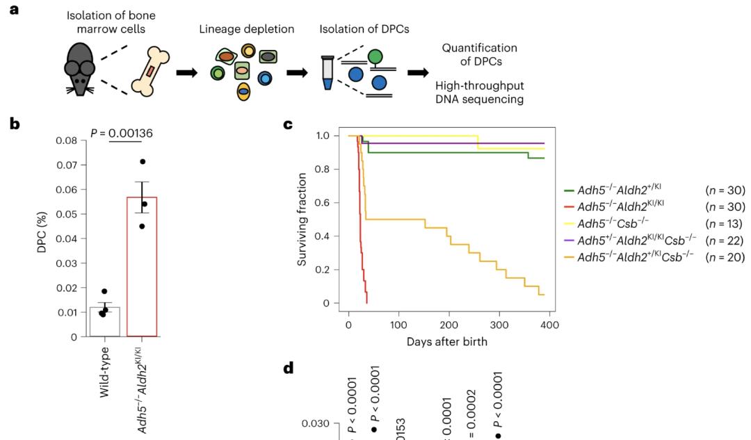 这些存在基因缺陷的小鼠,寿命明显更短,且体重低于正常;此外,它们还表现为贫血,即造血功能异常。总结来说,在醛类清除机制受损的小鼠中,AMeDS的症状明显,可见内源性醛类的累积与早衰疾病之间存在明显的关联性。