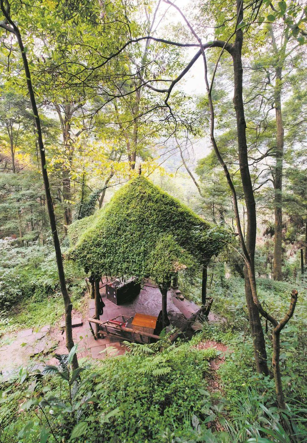 青城山的亭形态多样,亭顶上往往盖以树皮,粗朴而富于野趣。