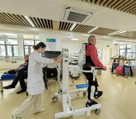 一进康复大厅,就被“超现代感”震撼:每台设备都在使用,一位身高1米8的老爷爷借助“外骨骼机器人”化身“机甲战士”,在大厅里训练着步态。他的爱人介绍,“我先生因疾病原因导致脊髓损伤不能行走,有了这个机器人托住,他可以练习正常的步态,他现在腿开始有力量了。”