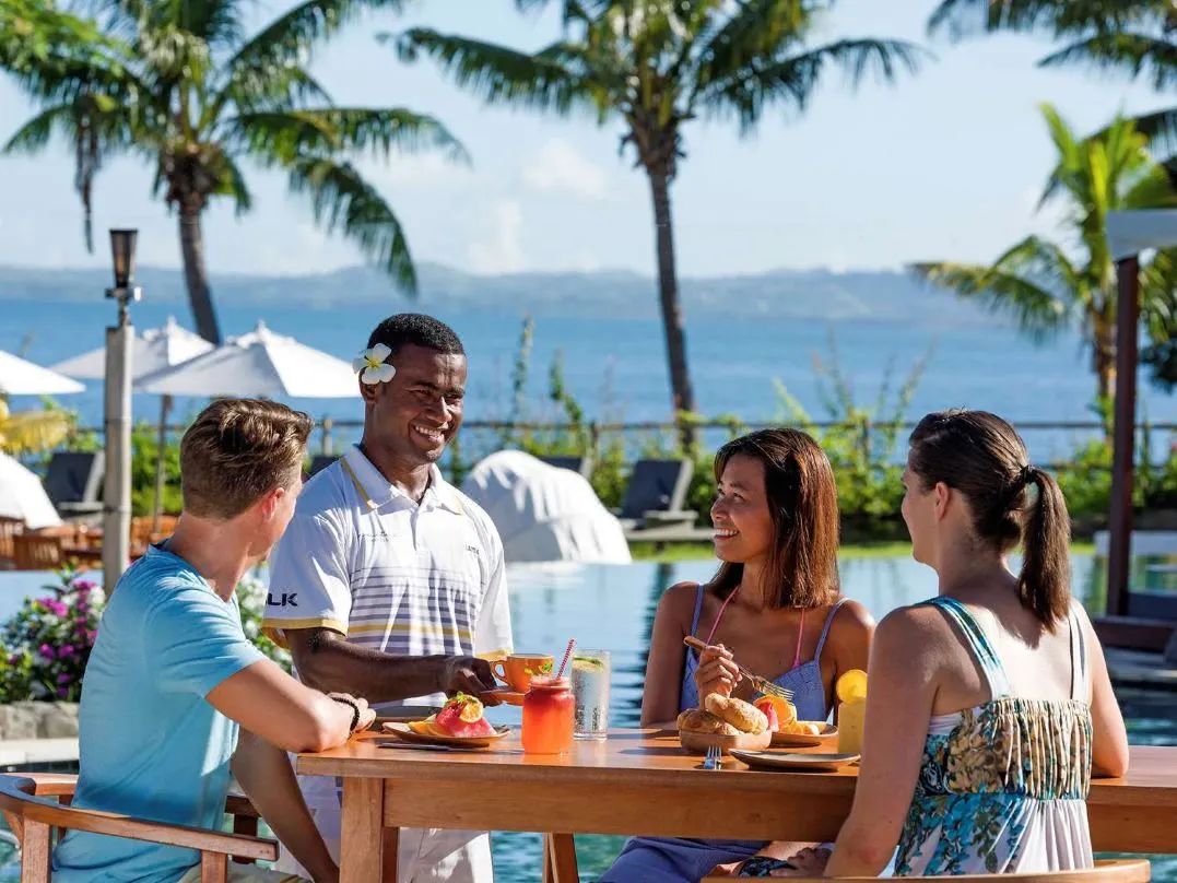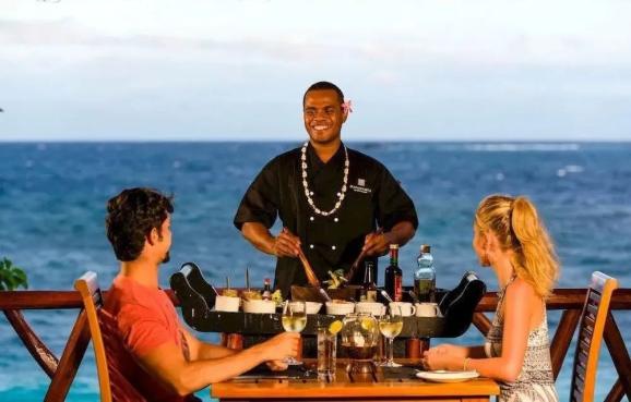 @图源马塔马诺阿岛度假村官方酒店内设有一家海景餐厅,提供国际美食。客人可以在游泳池畔或俯瞰着大海的露台上用餐,晚餐时分,还会有乐队来到每桌客人面前,唱歌助兴,整个餐厅在歌声和美景的加持下,更具浪漫。