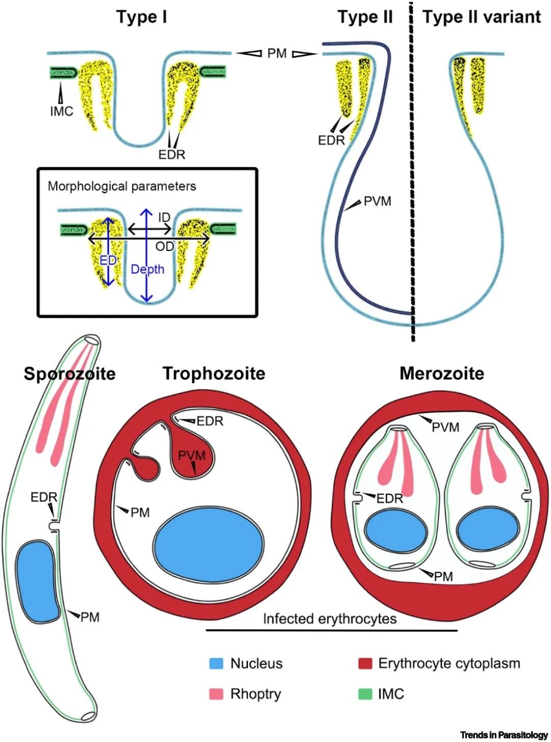 在18s-rRNA系统发育树的引导下,该综述重新分析了文献中的微孔形态学数据,揭示了微孔的重要规律性特征(图2)。疟原虫微孔具有可互转的两种形态(图1和2)。红内期疟原虫滋养体为II型微孔,是质膜和纳虫泡膜的双层膜内陷,且虫体缺少内膜复合体。II型微孔的膜内陷深度通常远大于I型微孔,孔径也稍大于I型。同样寄生于红细胞的巴贝斯虫和泰勒虫,它们的微孔也与疟原虫类似,子孢子为I型微孔,滋养体为II型微孔。但由于这两种原虫的纳虫泡膜在其入侵红细胞后很快就溶解了,它们的II型微孔仅有质膜内陷。鉴于II型微孔仅存在于少数几种原虫的红内期阶段[4],而以弓形虫微孔为代表的I型微孔是顶复门原虫中的更为普遍类型,因此在微孔的研究中更具代表性。