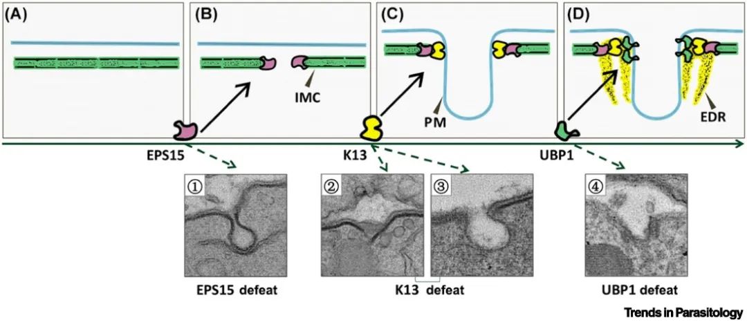 基于微孔蛋白组分的荧光显微镜数据和缺陷后的电镜结构,该综述提出了I型微孔形成的关键事件顺序(图4)如下:首先内膜复合体形成一个孔;随即质膜在孔内形成一个标准的杯状内陷;最后形成完整的EDRs结构。主要证据是EPS15、K13和UBP1的敲降分别导致内膜复合体缺少孔且异常内陷,质膜内陷过大或缺乏以及微孔开口过宽等[5, 8]。