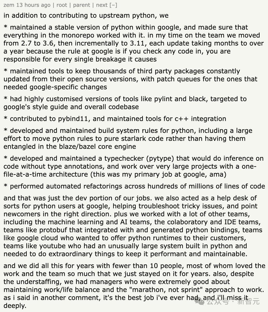 这些工作都是由不到10人的团队在几年间完成的,我们中的大多数人因为热爱这份工作和团队而长期留在这里。尽管人手不足,我们的管理者在确保工作与生活的平衡以及推崇「持久战而非冲刺」的工作方式方面做得非常出色。正如我在另一条评论中所提到的,这是我有过的最好的工作,我将深深地怀念它。