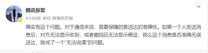 张军表示:对于通信来说,首要保障的是送达的准确性。如果一个人发送消息后,对方无法显示收到,或者撤回后无法显示痕迹,那么这个消息是否准确无误送达,就成了一个“无法说清”的问题。