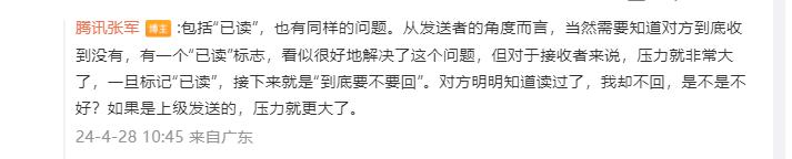 在评论区张军还回应了微信为何没有显示“已读”的功能。张军表示,从发送者的角度而言,当然需要知道对方到底收到没有,有一个“已读”标志,看似很好地解决了这个问题。但对于接收者来说,压力就非常大了,一旦标记“已读”,接下来就是“到底要不要回”。