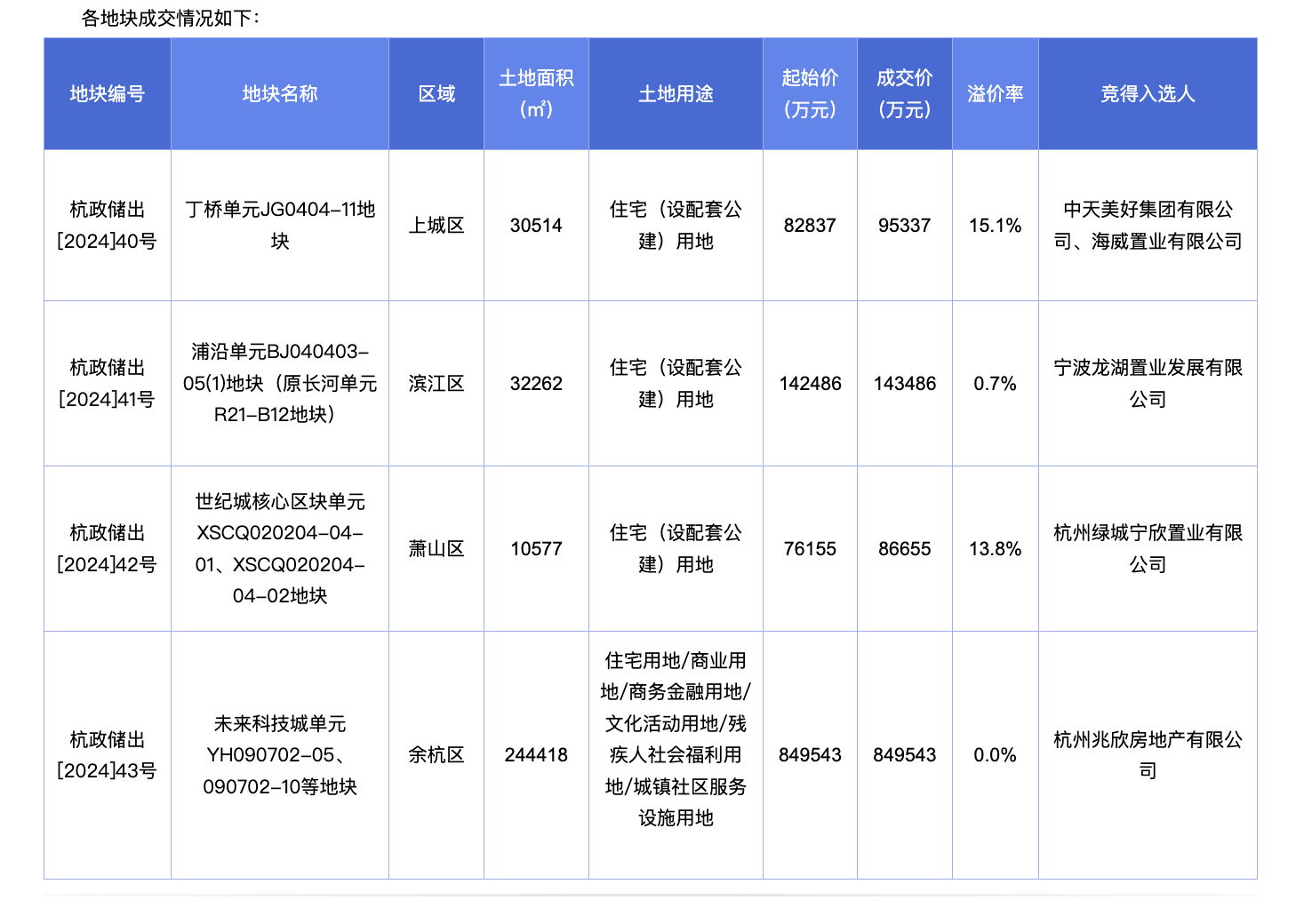 4宗地块中,起始总价最高的地块为杭政储出[2024]43号地块,即余杭区未来科技城单元YH090702-05、090702-10等地块,该地块东至规划水乡西路,南至规划万金路,西至规划公园绿地,北至绿汀路。该地块出让地上建筑面积461981平方米,起始总价849543万元。按照地块出让须知,本宗地块所建商品住房毛坯销售均价不高于32100元/平方米,且毛坯销售最高单价不高于35310元/平方米。如实施装修销售的,装修价格不高于4000元/平方米。