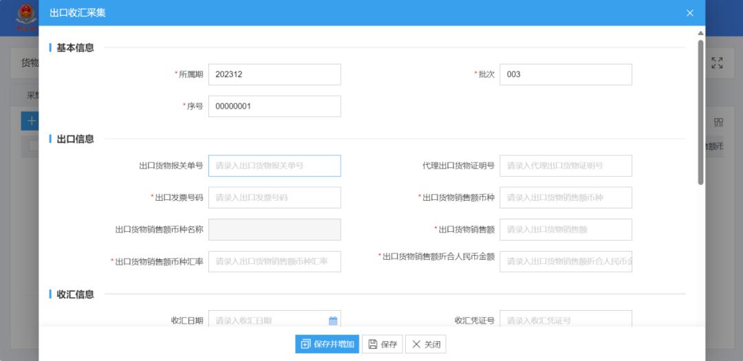3.点击【新建】按钮,根据凭证录入收汇信息。录入完成后点击【保存】,录入数据将与当月出口申报数据一并生成,完成申报。