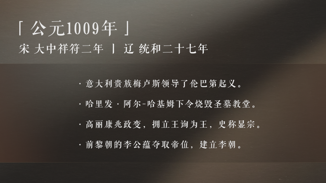 你好。这里是《文明之旅》节目。欢迎你,穿越到公元1009年。在中国,这一年是宋真宗大中祥符二年,辽圣宗统和二十七年。