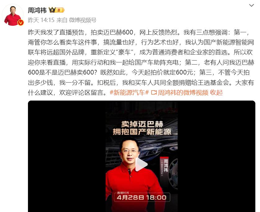 4月28日,周鸿祎在社交平台公开拍卖自己开了9年的座驾迈巴赫S600,起拍价为600元。据介绍,这款迈巴赫S600新车原指导价为288.8万元。周鸿祎的这辆二手车是2015年款,目前市场评估价为90万元左右。