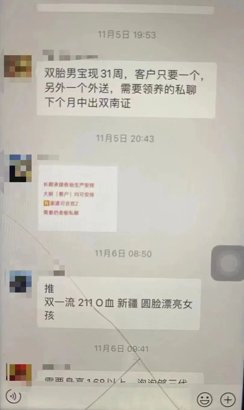在代孕中介群里,他常常看到一些广告:“双胎男宝现31周,客户只要一个,另外一个外送,需要领养的私聊……”