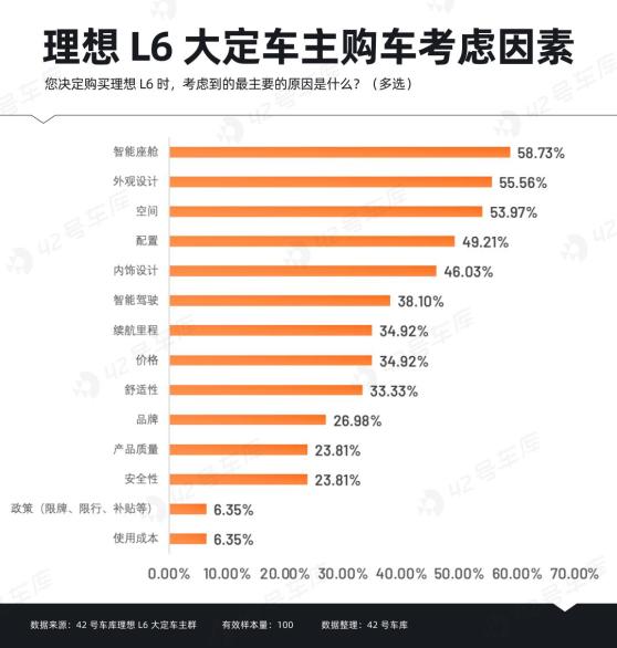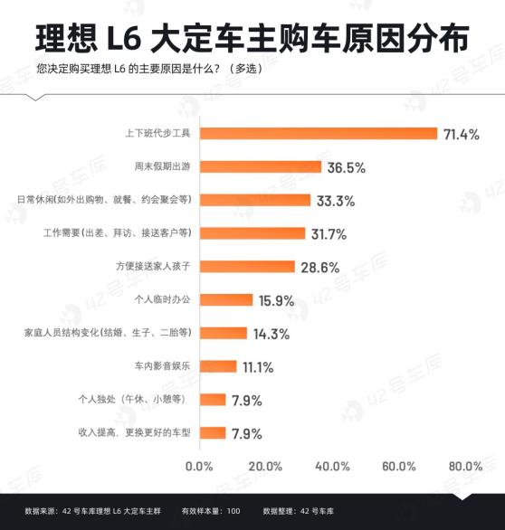 理想 L6 发布后,我们针对大定车主开展了问卷调研,以下是本次调研的核心分析结果。调研渠道:42 号车库理想 L6 大定车主群