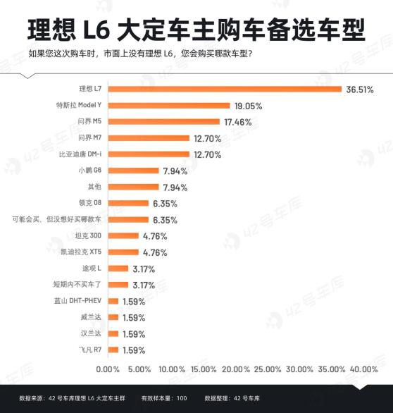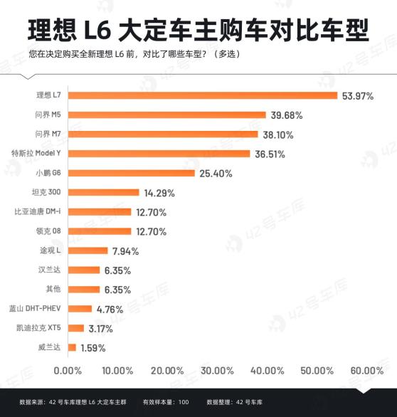 在理想 L6 大定车主中,主要对比的是理想自家车型 - 理想 L7,这部分用户占比高达 53.97%,并且如果没有理想 L6 的情况下理想 L7 的备选率达到了 36.51%。