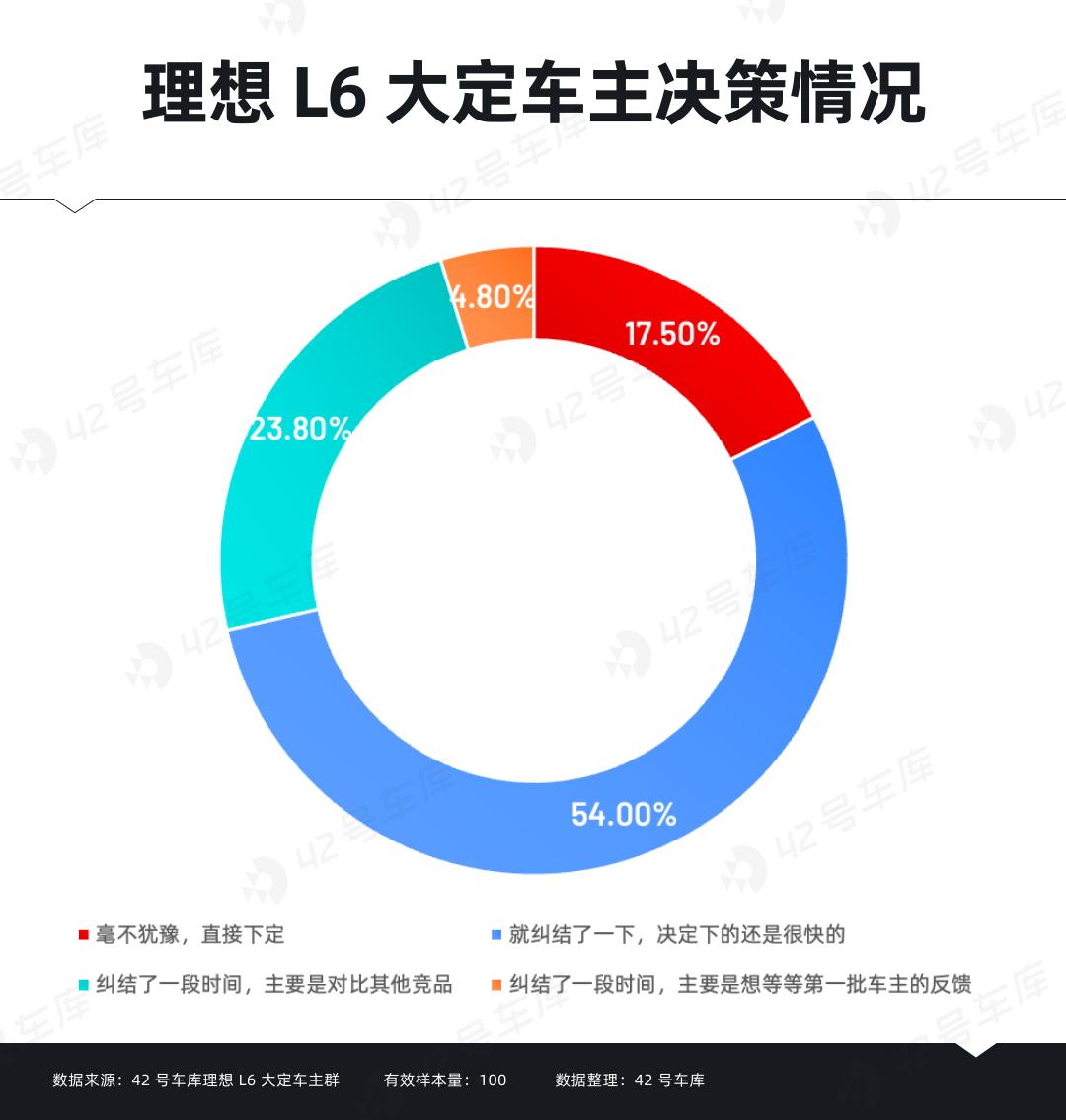 在购车决策方面受访者表达了对理想 L6 的认同情况,有 54% 的大定用户表示「就纠结了一下,下定还是很快的」,其次是「纠结了一段时间,主要是对比其他竞品」的大定用户占比为 23.8%,甚至有 17.5% 的用户好不犹豫直接下定,等第一批车主反馈的用户极少,这与理想 L789 在之前打下的口碑密不可分。