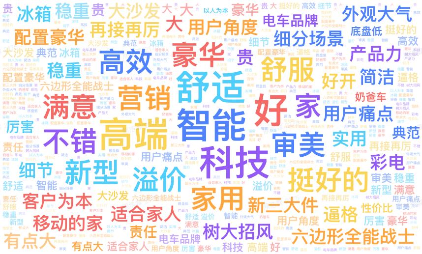 在对理想品牌的评估中,受访者普遍认为「智能」、「科技」和「舒适」是该品牌最突出的特点。尽管部分用户对理想品牌的印象包含「营销」「有点大」等负面词汇,但总体而言,大定车主对理想品牌的正面评价明显占优。这表明理想品牌在用户心目中的形象主要受到其产品智能化、科技感和舒适性的积极影响。