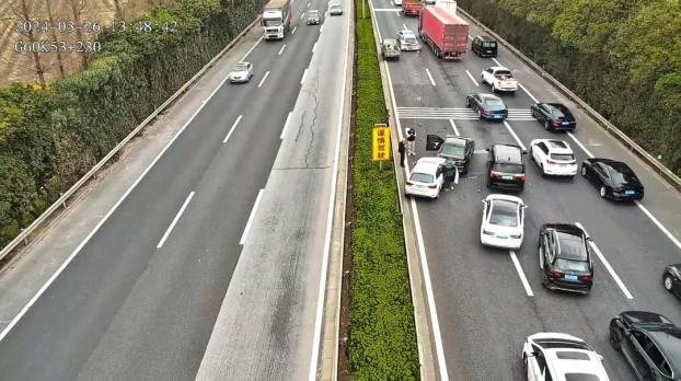 2024年3月26日13时56分许,在上海市松江区G60沪昆高速上海方向53.1公里处,发生一起多车碰撞交通事故。一辆轻型货车因故障在一号车道抛锚,短短几分钟内,6辆小轿车相继追尾,事故造成涉事车辆受到不同程度的挤压变形。