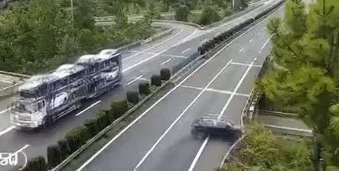 ▲ 黑色轿车在高速公路上碰撞护栏,后排乘客被甩出后掉下高架桥。