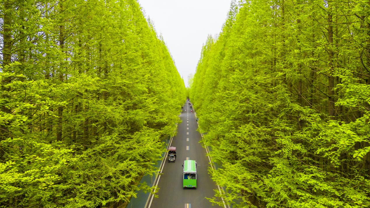 海风轻抚着脸庞,坐着观光车穿过一片青绿的树林,荷花池扑面而来,一条蜿蜒的木栈道延伸到池塘深处。一路向东,金沙滩就出现在眼前。