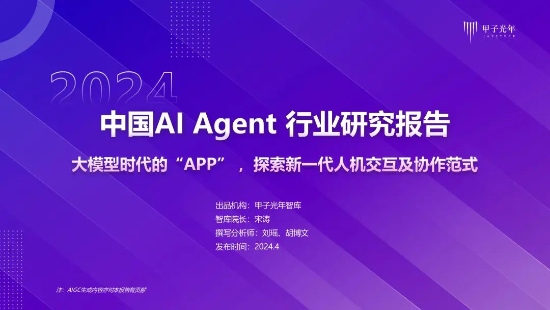 原标题:《《2024年AI Agent行业报告》——大模型时代的“APP”,探索新一代人机交互及协作范式|甲子光年智库》