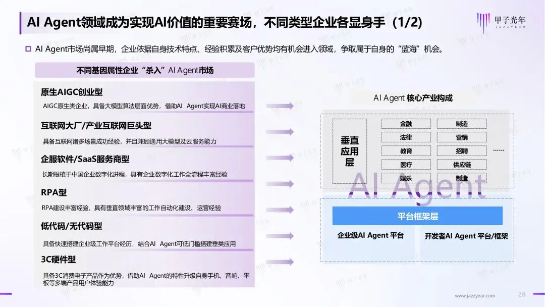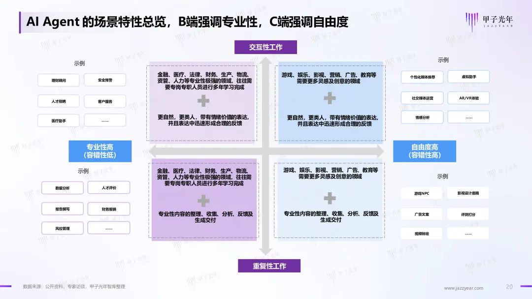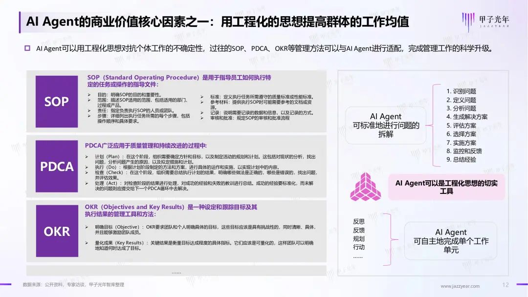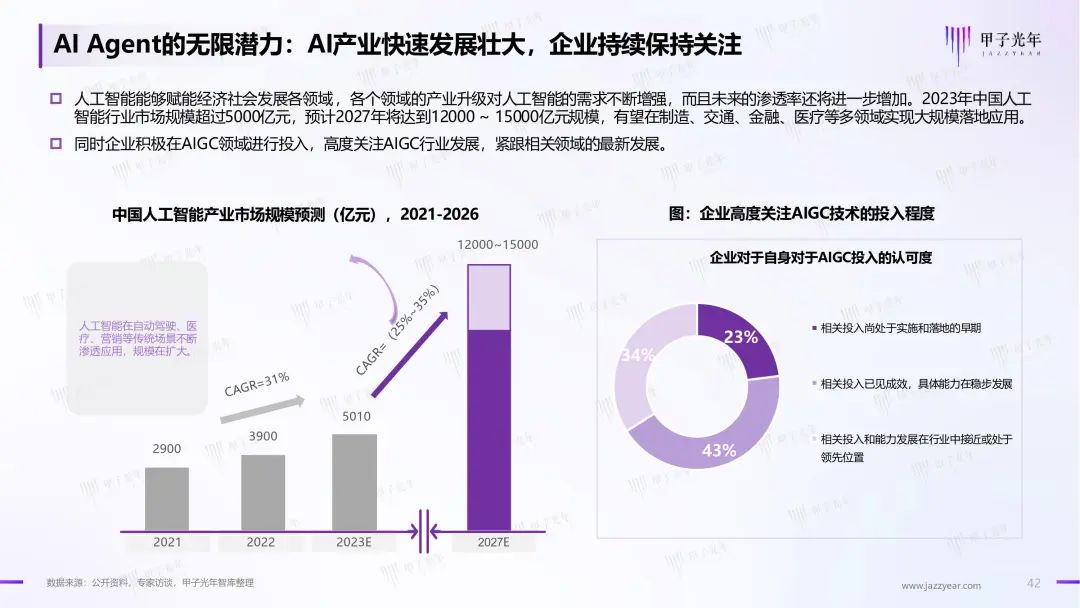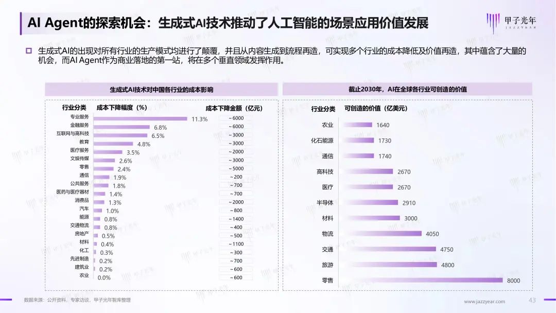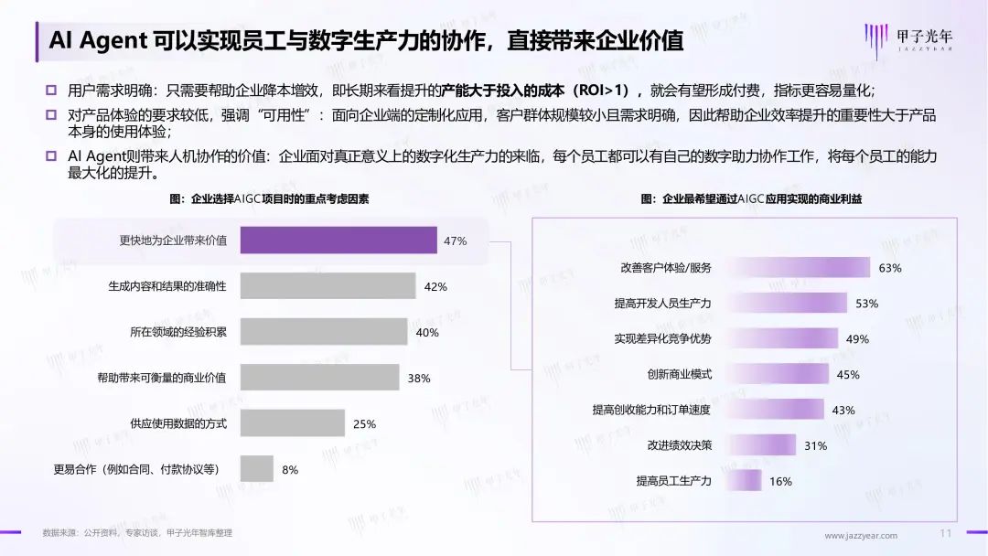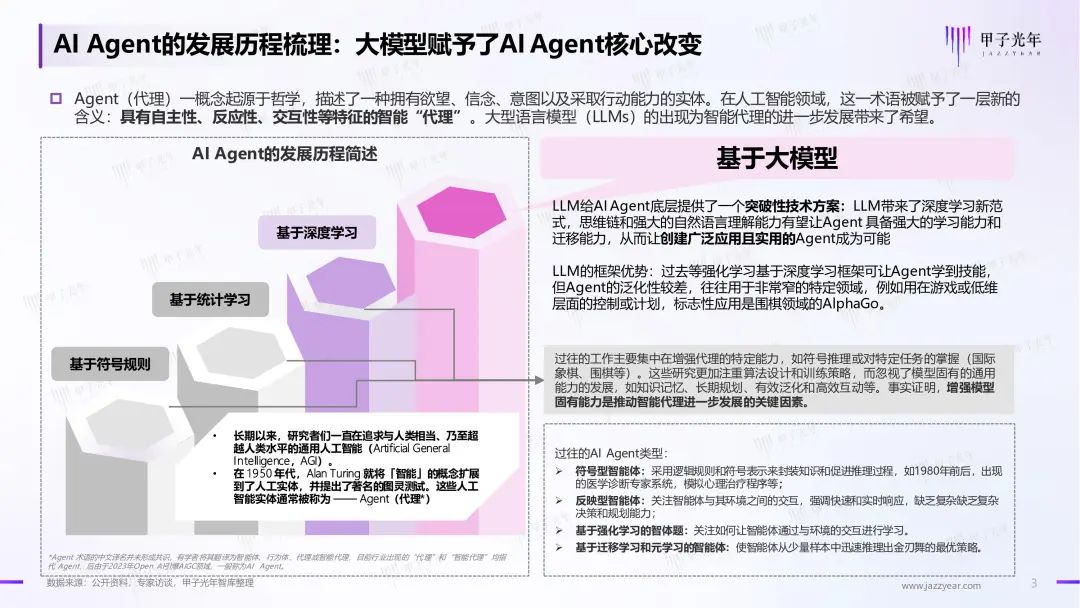 因此甲子光年推出《2024年AI Agent行业报告》,探讨AI Agent在概念变化,学术及商业界的尝试与探索,对各行业、各场景对于AIGC技术的需求进行调研及梳理,展示AI Agent领域近期的突破及商业实践范式,对未来行业的趋势进行研判。