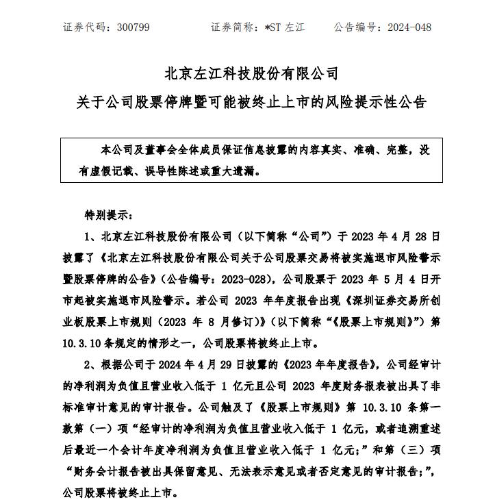 4月28日晚,*ST左江公告称,公司经审计的2023年净利润为负值且营业收入低于1亿元,同时,公司2023年度财务报表被出具了非标准审计意见的审计报告,触及股票上市规则相关规定的终止上市情形,公司股票将被终止上市。