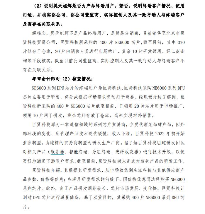 此外,昊天旭辉仅是贸易分销商,终端用户为北京市巨贤科技贸易有限公司(简称“巨贤科技”)。据年审会计师核查,巨贤科技所采购的400片NE6000芯片,已领用20片用于市场推广,领用10片用于研发,剩余芯片存放于仓库,尚未实现对外销售。