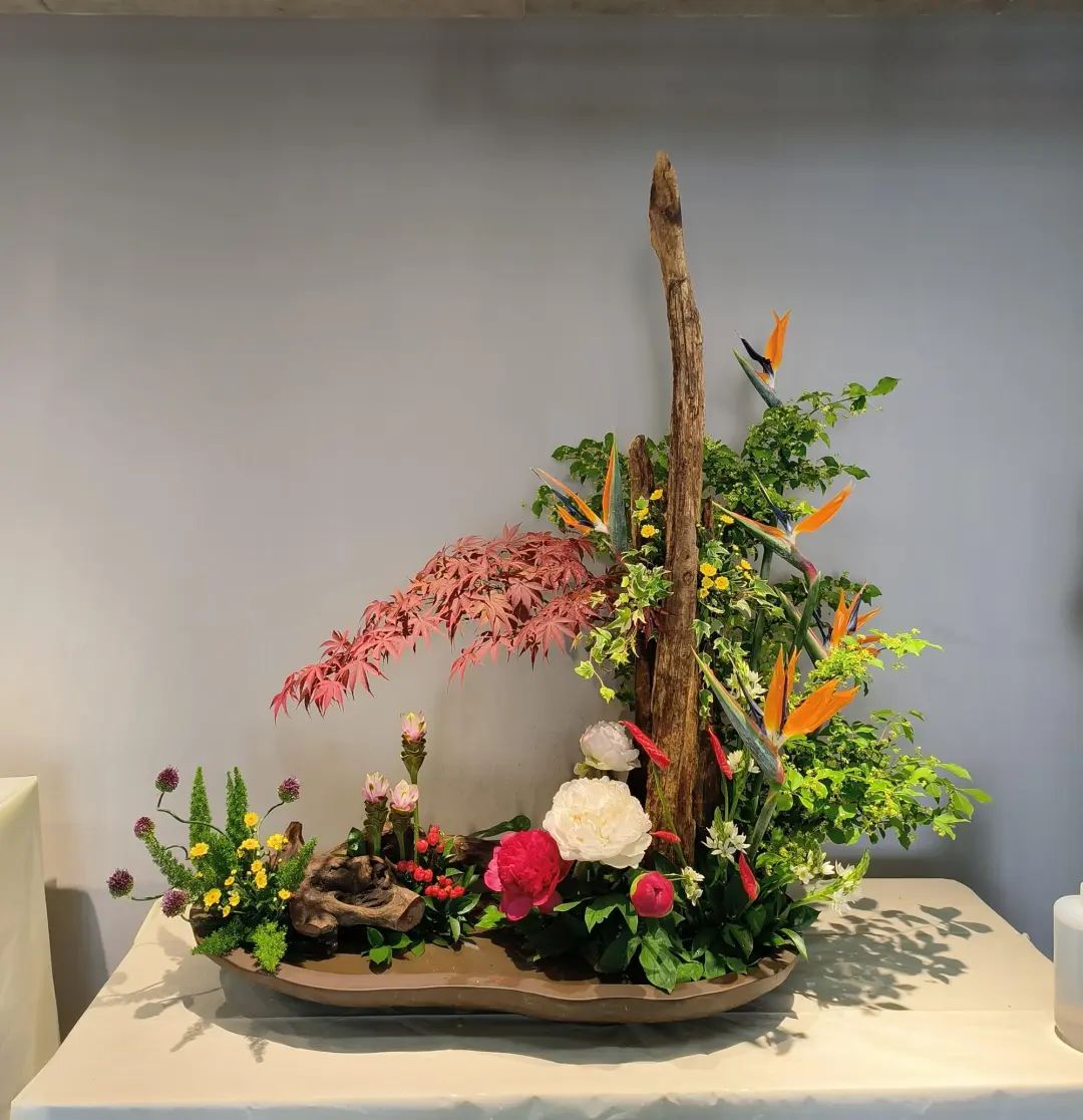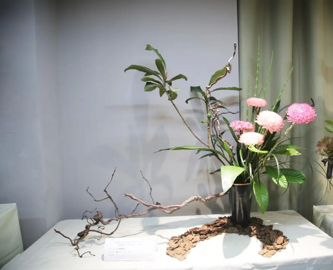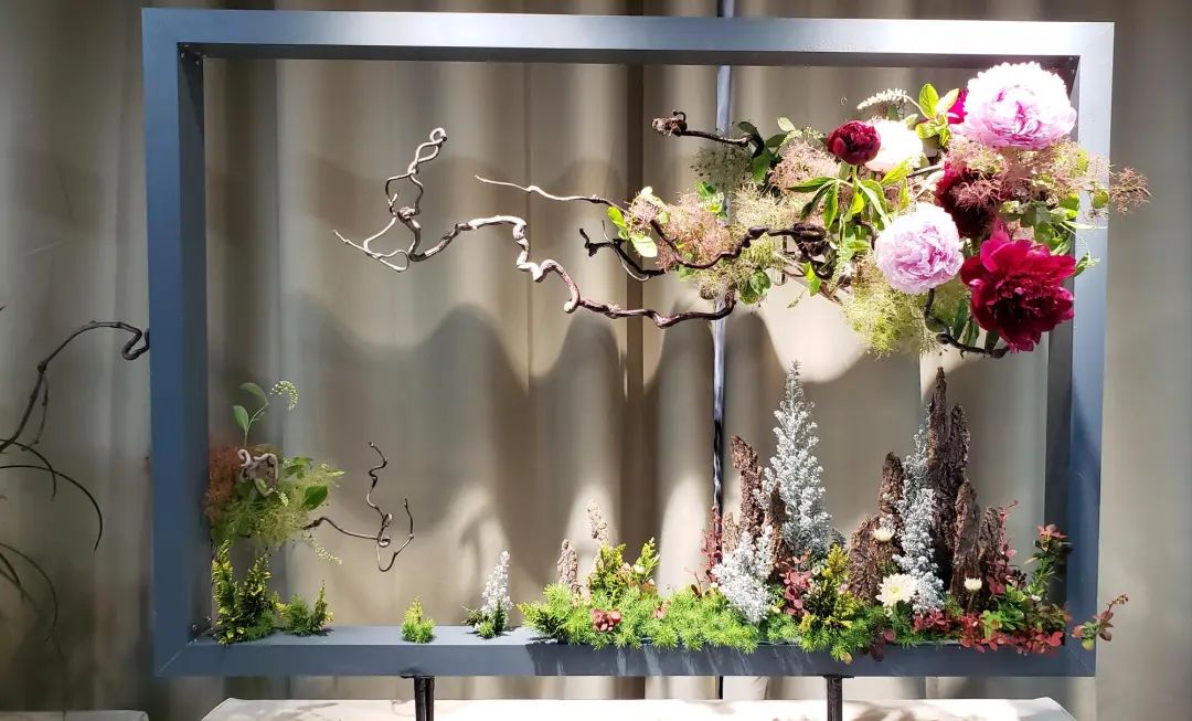 大量使用时令花材,如芍药、绣球、牡丹菊等,在盆、篮、筒、瓶花中形成亮丽的焦点花,观赏性极强。王路昌的《风光无限》传统插花风格,运用中国绘画和盆景艺术,枯木为山,盆中有水,芍药、姜花、歪葱、红果等植物材料,形成一个花艺大盆景;朱道义的现代花艺作品《春风拂槛露华浓》,通过马蹄莲、蝴蝶兰、朝鲜蓟、手球、红豆、松虫草等植物来表达现代化大都市正勇立在时代发展的潮头、生态文明示范的主题;刘成林的现代花艺框景作品,用写景式的手法,有山有水有景,龙枣枝的走向飘逸潇洒,由左向右一路如祥云飘过,芍药、黄栌等植物恰到好处地布置其中。