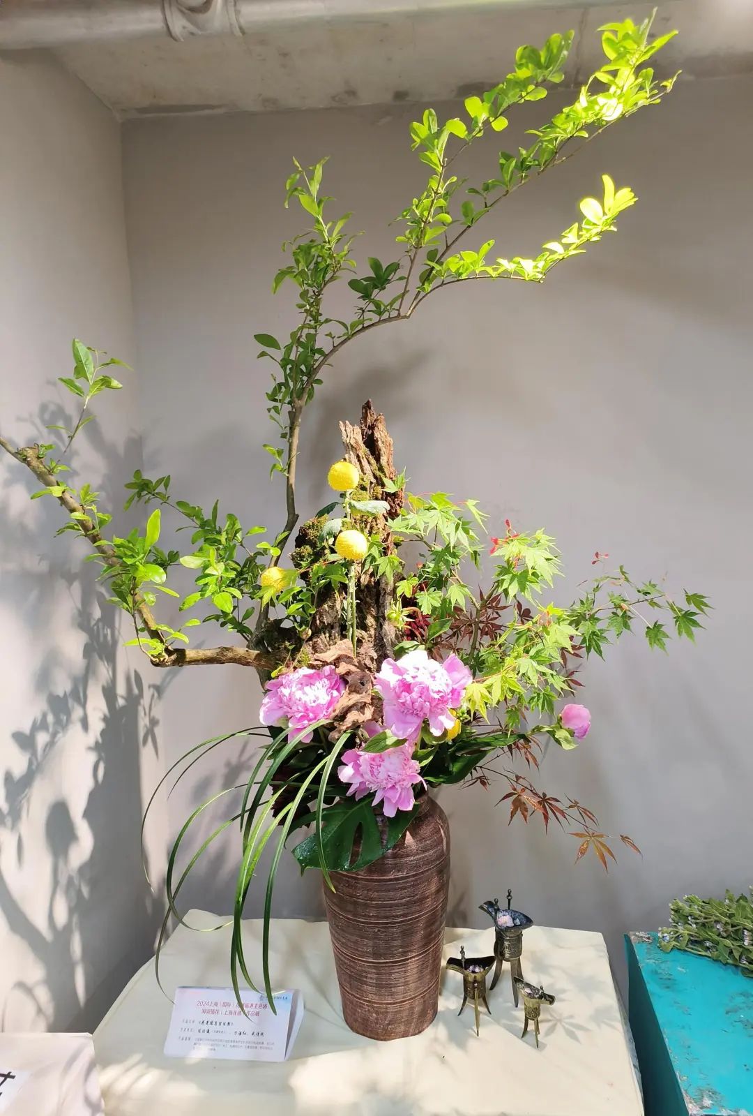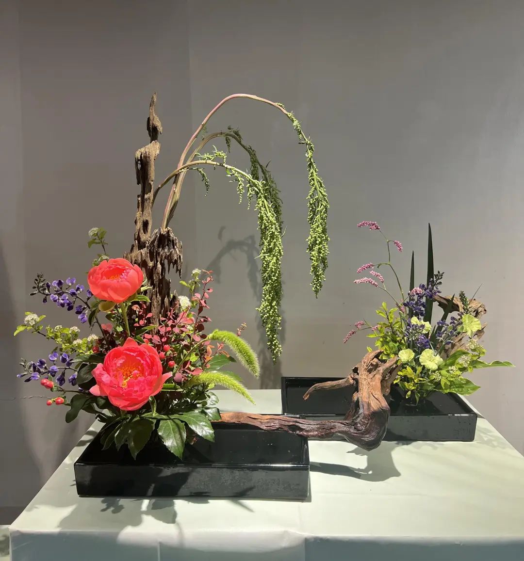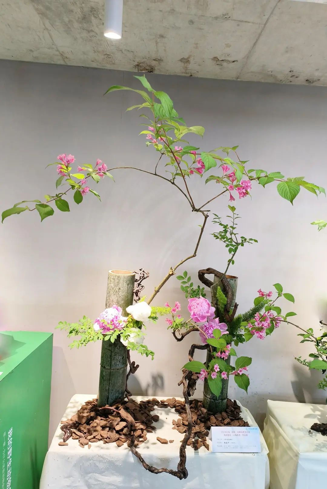 大量使用时令花材,如芍药、绣球、牡丹菊等,在盆、篮、筒、瓶花中形成亮丽的焦点花,观赏性极强。王路昌的《风光无限》传统插花风格,运用中国绘画和盆景艺术,枯木为山,盆中有水,芍药、姜花、歪葱、红果等植物材料,形成一个花艺大盆景;朱道义的现代花艺作品《春风拂槛露华浓》,通过马蹄莲、蝴蝶兰、朝鲜蓟、手球、红豆、松虫草等植物来表达现代化大都市正勇立在时代发展的潮头、生态文明示范的主题;刘成林的现代花艺框景作品,用写景式的手法,有山有水有景,龙枣枝的走向飘逸潇洒,由左向右一路如祥云飘过,芍药、黄栌等植物恰到好处地布置其中。