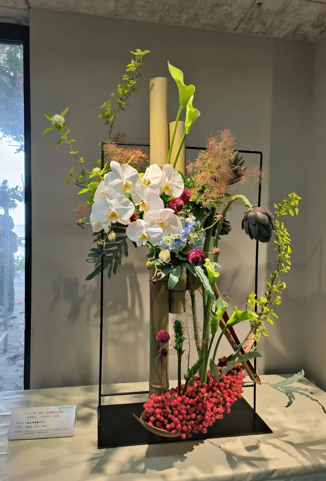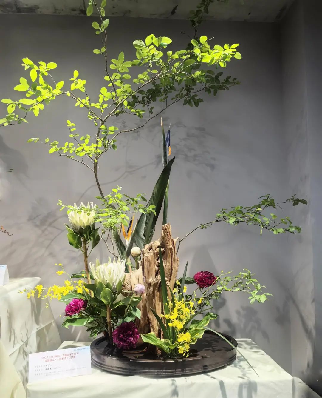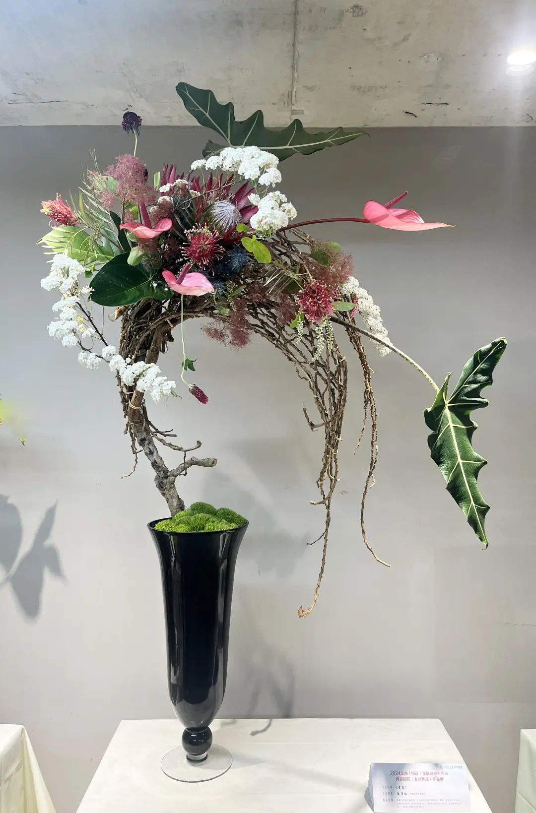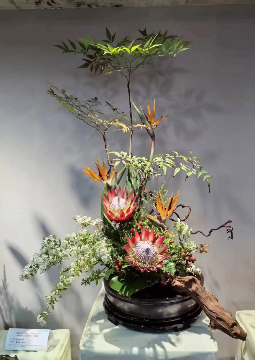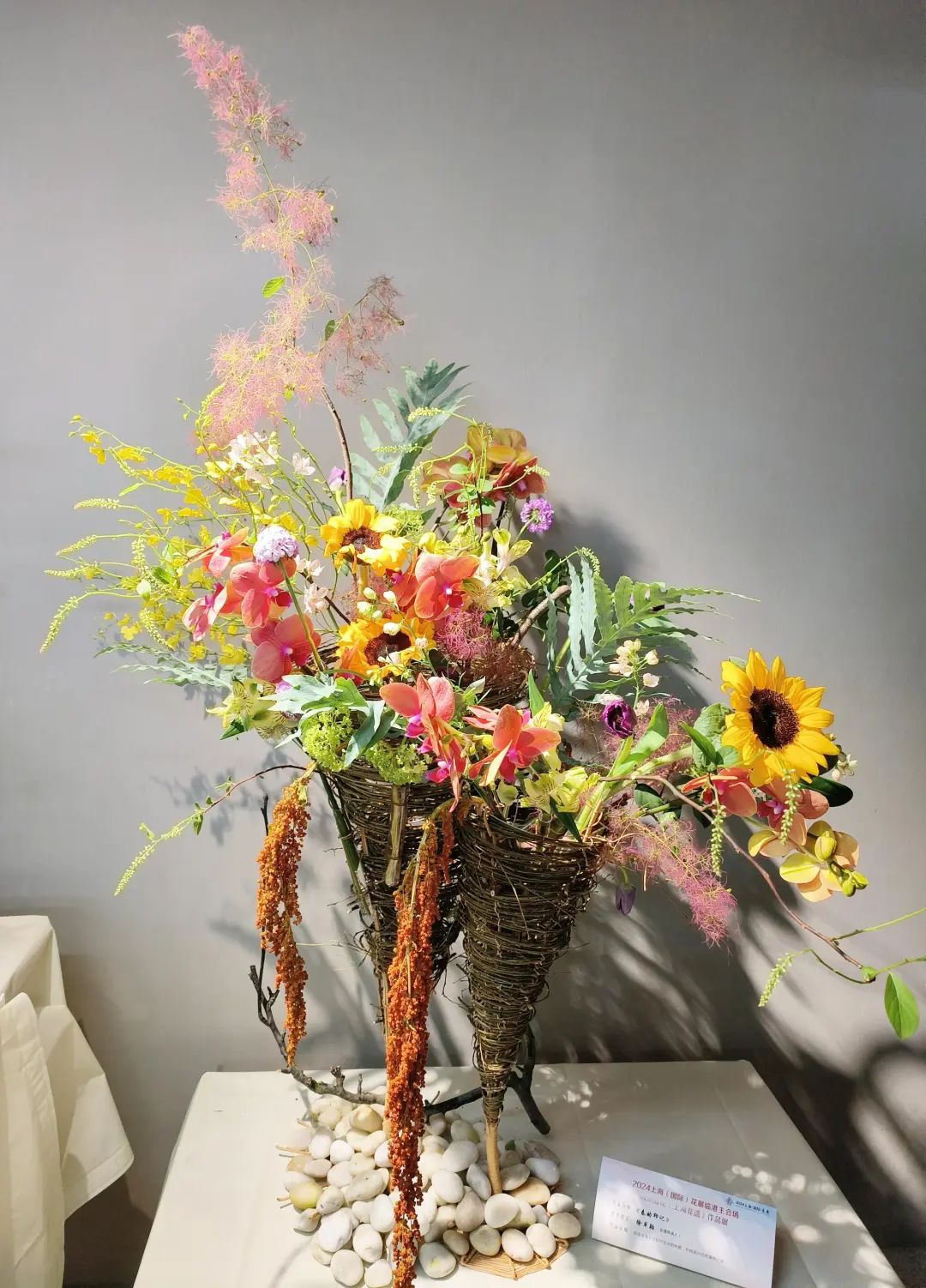 从大型的架构作品到细腻的篮花、筒花,形式多样。如王志东大师的大型架构作品《爱的使者》面朝滴水湖,以油画调色板的色彩交响乐,在湖畔悠扬地响起来,德国芦苇、蝴蝶兰、晚樱、雾中情人、青枫、五针松、桦树枝、梨树、苔藓、棕榈棕、竹篾片等,让一个大型的花艺拱门花团锦簇、风光无限。梁胜芳大师的《蒸蒸日上》以10只半圆和整圆的蒸笼及大型构架为载体,三个铁架前后布置,用枯藤串联,使用帝王花、大花蕙兰、菊花、葱花、蝴蝶兰等30种植物,融合花境、花街、花箱等多种园艺手段,形成一个百花齐放的中式小花园。