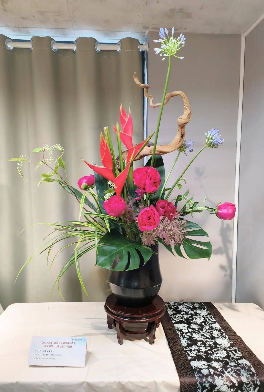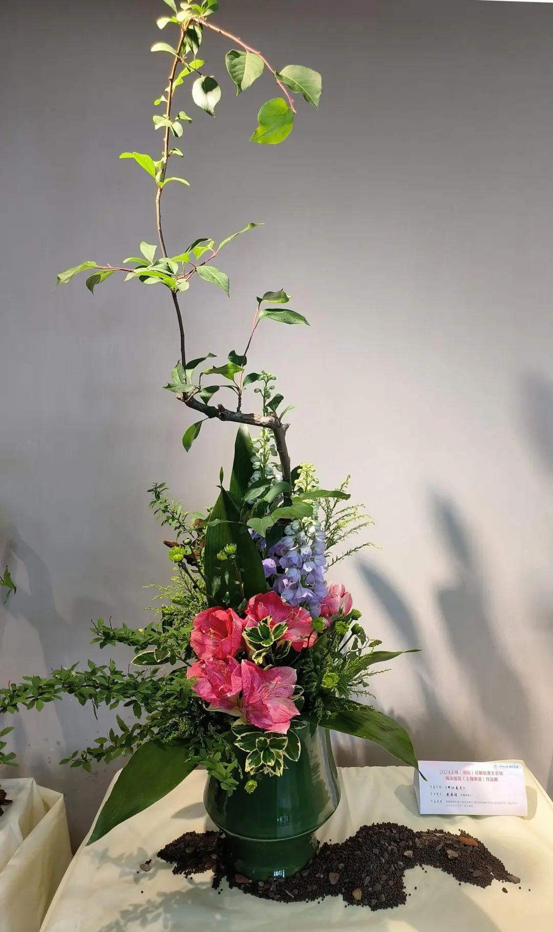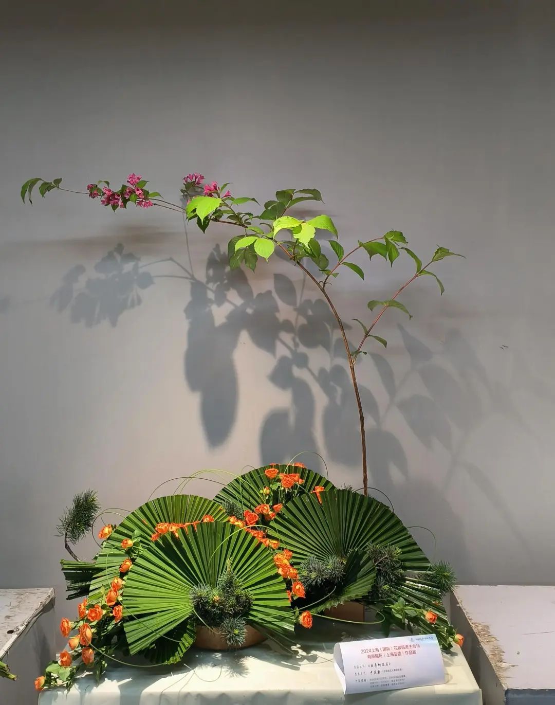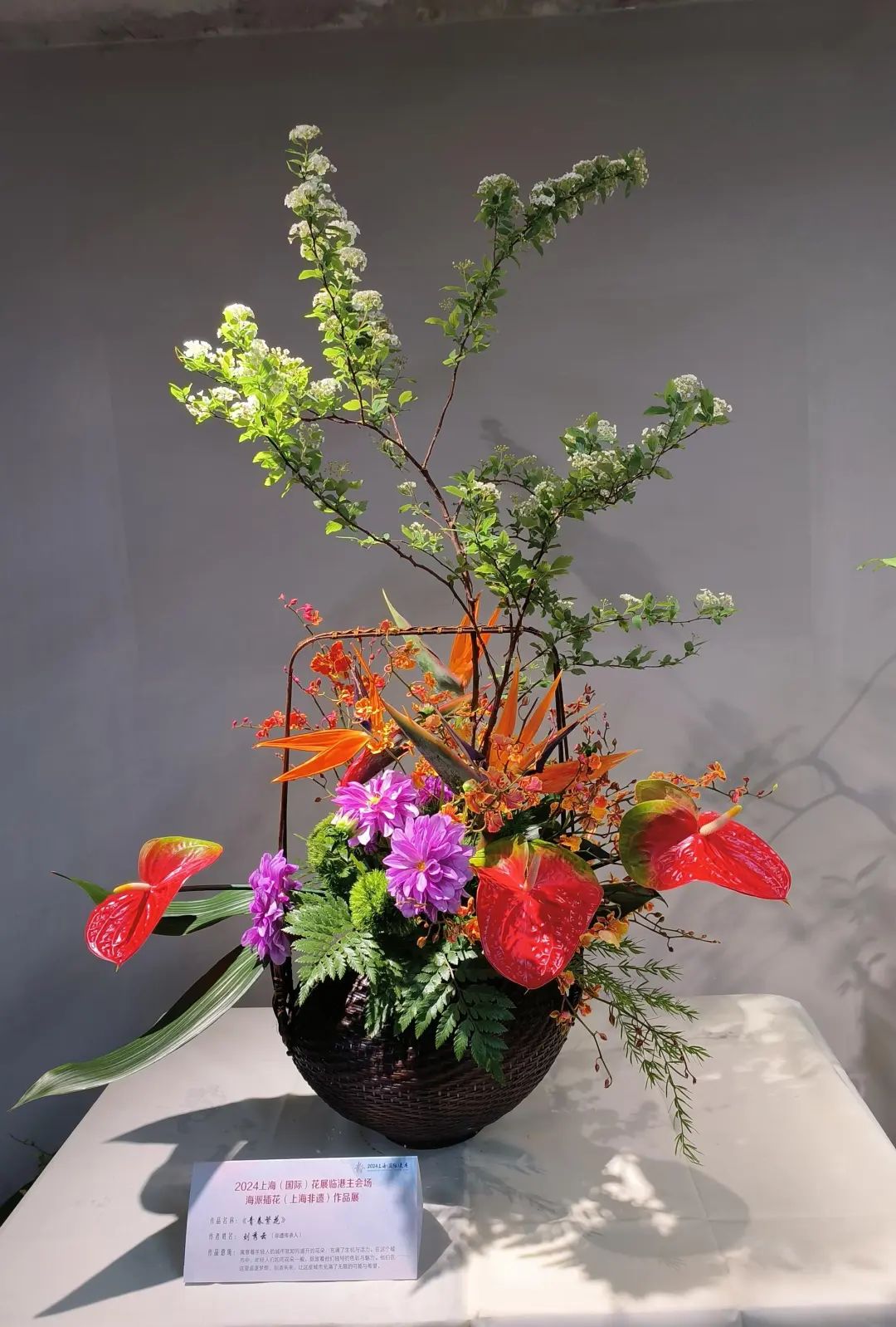 上海海派插花根植于中国传统插花艺术,融合东西方插花艺术之精粹,形成了有中国特点、上海特色、时代特征的插花艺术,深受国内外花艺爱好者的喜爱。据上海市插花花艺协会会长傅徽楠介绍,本次展示的21件以中国插花花艺大师为代表的创作作品,以不同的插花花艺形式,各种组合造型艺术,体现出不同的意境,让人感受到“年轻的城年轻人的城”的丰富多彩,提升公众对非遗插花花艺的钟爱。21个作品具有三个明显的特点: