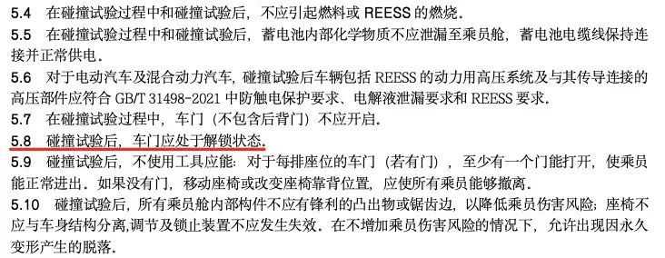 在 2021 版的 C-NCAP ( 中国新车评价规程 )里,也加入了正面碰撞后必须主动解锁车门的要求,没有这功能,在碰撞测试的成绩里就会扣 1 分。