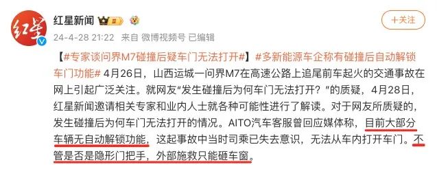 比如说在问界这个事故里, M7 到底有没有自动给车门解锁?