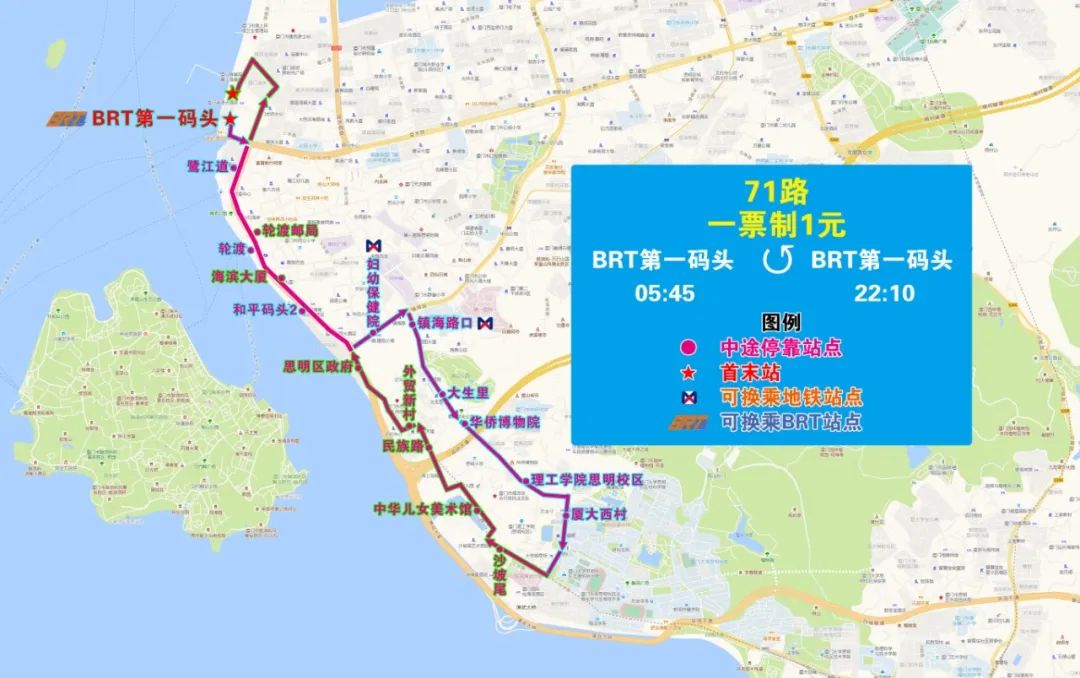 (1)线路走向(单向运行):BRT第一码头始发,经西堤路、厦禾路、鹭江道、镇海路、思明南路、演武路、大学路、民族路、鹭江道、西堤南三路、西堤路至BRT第一码头。