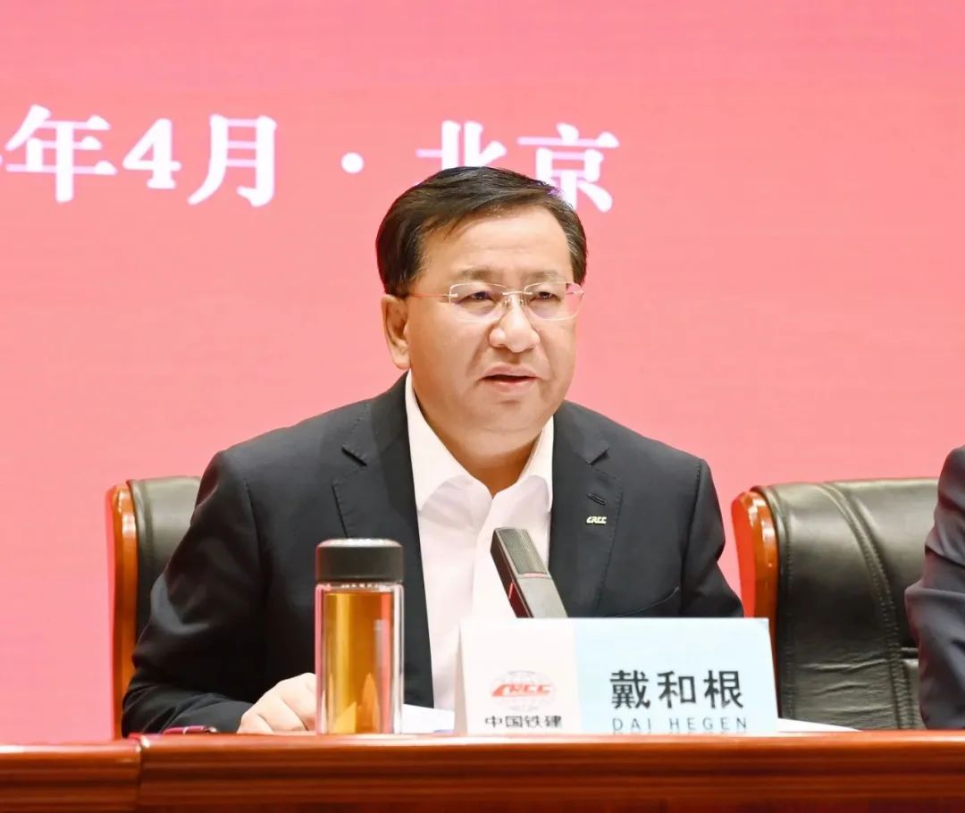 会议现场中国铁建党委书记、董事长戴和根出席会议并讲话,总裁、党委副书记、执行董事王立新主持会议;党委常委、副总裁赵佃龙作海外工作报告。