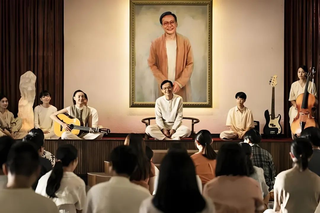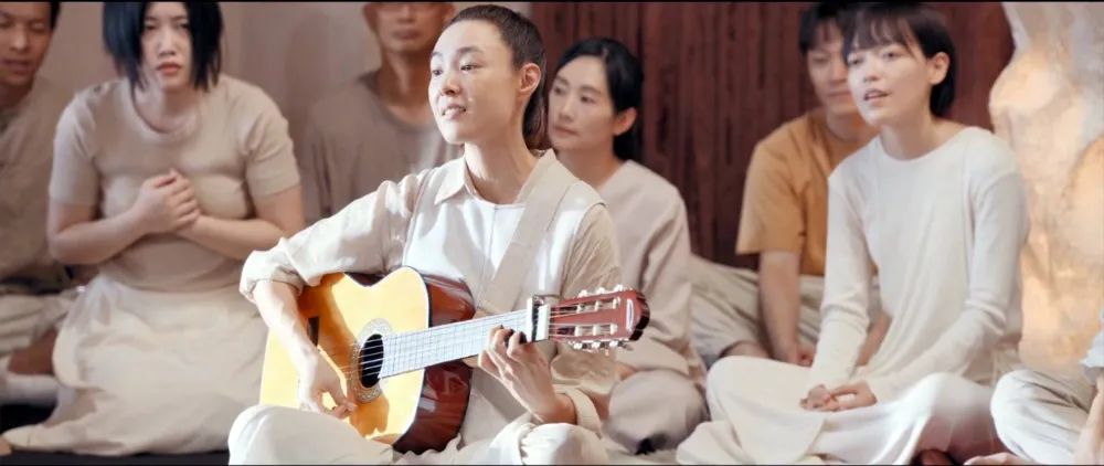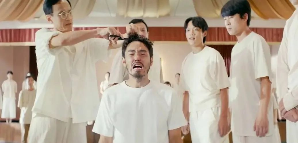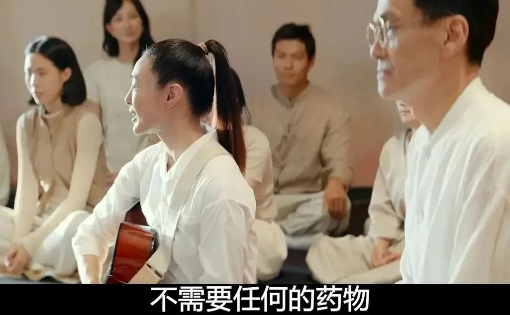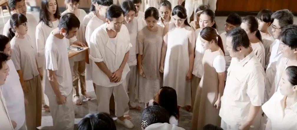 影片中灵修组织精心设计的洗礼场面,非常有仪式感。就是让陈桂林跪在众人面前,在教主的引导下,大声说:“我感谢天地,我感谢父母,我是罪人,我危害人间,我辜负苍生,我愿抛开一切,消除名利权力,舍弃金钱物质,归于真我。”同时其他人对陈桂林进行鞭笞。