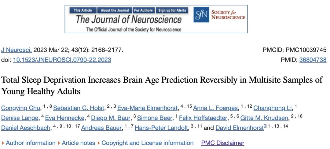 [1]Chu C, Holst SC, Elmenhorst EM, Foerges AL, Li C, Lange D, Hennecke E, Baur DM, Beer S, Hoffstaedter F, Knudsen GM, Aeschbach D, Bauer A, Landolt HP, Elmenhorst D. Total Sleep Deprivation Increases Brain Age Prediction Reversibly in Multisite Samples of Young Healthy Adults. J Neurosci. 2023 Mar 22;43(12):2168-2177. doi: 10.1523/JNEUROSCI.0790-22.2023. Epub 2023 Feb 20. PMID: 36804738; PMCID: PMC10039745.